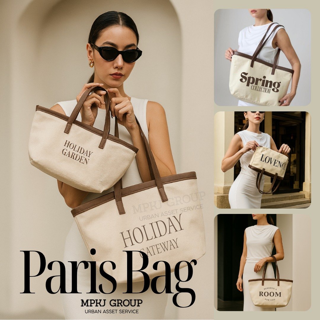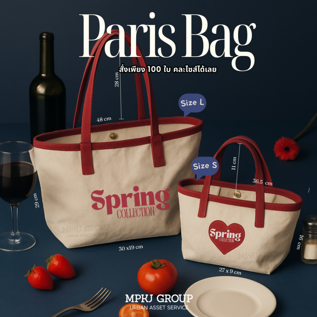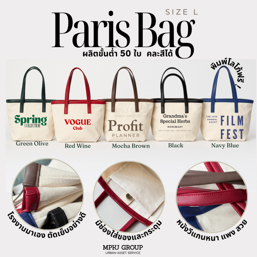 รุ่นParis มี 2 Size ที่มีสตอคพร้อมพิมพฺโลโก้รองรับงานด่วน คือ Size L แบบ Tote Bag จุของได้เยอะ และ Size S ใส่ไอแพดได้ พร้อมหนังวีแกนเกรดเหมือนขายในห้าง สวยคลาสสิค ผ้าแคนวาส 14 oz. ตั้งทรงสวย